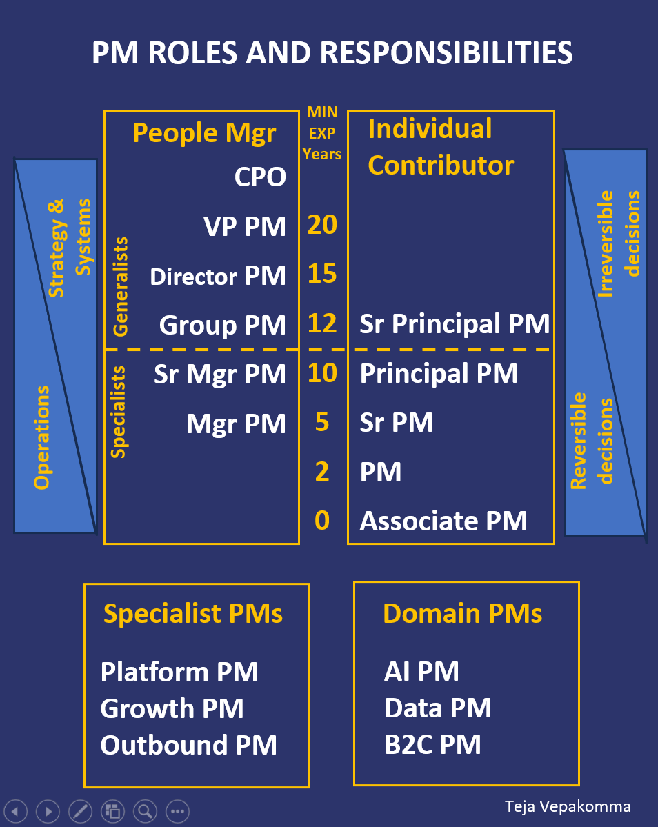 People Manager PMs are focused on scaling product portfolios and platforms. They bring cross-functional cohesion in decision-making. They remove obstacles for product teams, invest and fine tune product systems and processes. They coach PMs, define product strategy tradeoffs, and ensure that execution remains aligned with business priorities. Their impact is less about shipping features and more about creating leverage through systems, frameworks, and culture.